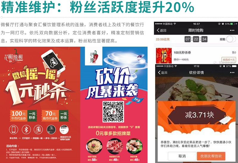 從排隊(duì)網(wǎng)提供的數(shù)據(jù)來(lái)看,微餐廳能夠有效提升粉絲量30%,提升粉絲活躍度20%?;ń酚鲆?jiàn)辣椒加入微餐廳后的運(yùn)營(yíng)數(shù)據(jù)也證明了這一點(diǎn):截至2015年12月底,花椒遇見(jiàn)辣椒微餐廳的粉絲數(shù)50000多人,微會(huì)員數(shù)40000多人,微會(huì)員訂單占比達(dá)47.81%?!耙辉霘?微信搖一搖“的線上營(yíng)銷活動(dòng)活動(dòng),在7天內(nèi)售出優(yōu)惠票券2770張,實(shí)際使用票券1790張,票券使用率高達(dá)65%,產(chǎn)生額外營(yíng)收37萬(wàn)多元。
