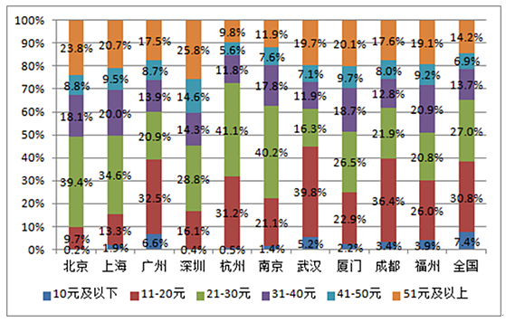 全國(guó)及重點(diǎn)城市餐飲外賣訂單客單價(jià)分布占比