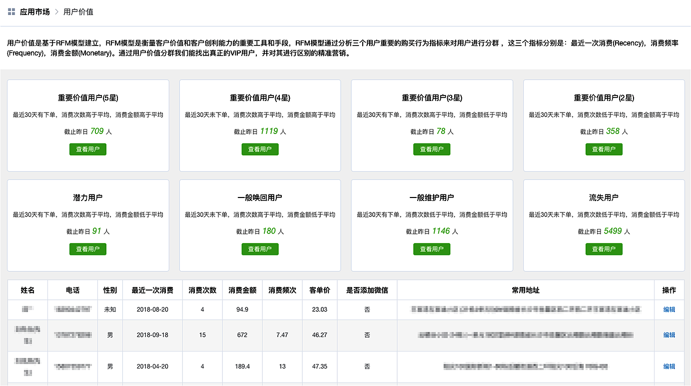 用戶價(jià)值是基于RFM模型建立,RFM模型是衡量客戶價(jià)值和客戶創(chuàng)利能力的重要工具和手段,RFM模型通過(guò)分析三個(gè)用戶重要的購(gòu)買行為指標(biāo)來(lái)對(duì)用戶進(jìn)行分群 ,這三個(gè)指標(biāo)分別是:最近一次消費(fèi)(Recency),消費(fèi)頻率(Frequency),消費(fèi)金額(Monetary)。通過(guò)用戶價(jià)值分群我們能找出真正的VIP用戶,并對(duì)其進(jìn)行區(qū)別的精準(zhǔn)營(yíng)銷。依據(jù)經(jīng)典的二八原則,我們80%的銷售由20%的用戶貢獻(xiàn),那么我們?nèi)绾慰焖俣珳?zhǔn)的找到那20%用戶并與其發(fā)生深度關(guān)聯(lián),是極度考驗(yàn)我們對(duì)數(shù)據(jù)的綜合分析處理能力的。同時(shí)我們也可以做一個(gè)實(shí)驗(yàn),去美團(tuán)后臺(tái)使用精準(zhǔn)營(yíng)銷,給高消費(fèi)熟客與需一般挽留的流失顧客發(fā)同樣的優(yōu)惠券,高消費(fèi)熟客的使用率會(huì)遠(yuǎn)遠(yuǎn)高于需一般挽留的流失顧客。