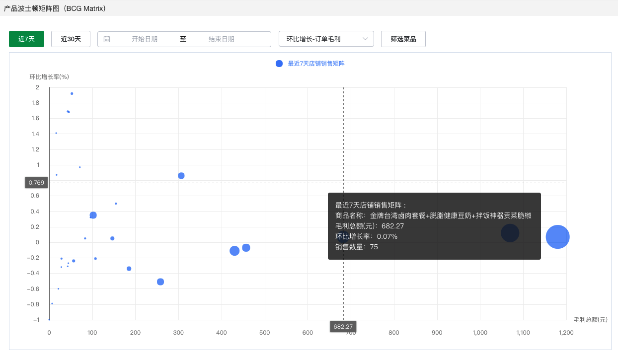 如圖我們選取了兩個(gè)維度,環(huán)比增長(zhǎng)率與訂單毛利。右下角代表現(xiàn)金牛產(chǎn)品,他的銷售波動(dòng)穩(wěn)定能夠持續(xù)貢獻(xiàn)收入,我們對(duì)這類產(chǎn)品的態(tài)度是要持續(xù)保持生產(chǎn)的穩(wěn)定,同時(shí)規(guī)模化的生產(chǎn)采購(gòu)以進(jìn)一步降低成本。右上角代表明星產(chǎn)品,這類產(chǎn)品的環(huán)比增長(zhǎng)迅速,利潤(rùn)貢獻(xiàn)可觀,對(duì)這類產(chǎn)品的態(tài)度是要持續(xù)觀察其穩(wěn)定程度,使其盡快穩(wěn)定過(guò)渡到現(xiàn)金牛產(chǎn)品,如果這個(gè)象限中像圖中所示沒(méi)有產(chǎn)品,那么表示企業(yè)的產(chǎn)品研發(fā)能力出現(xiàn)問(wèn)題,并沒(méi)有產(chǎn)生新的可以成長(zhǎng)的產(chǎn)品,需要反思。左上角為問(wèn)題產(chǎn)品,他的增長(zhǎng)速度快,但是毛利較低,對(duì)這類產(chǎn)品的態(tài)度是要盡快的調(diào)整利潤(rùn)與營(yíng)銷策略。左下角為瘦狗產(chǎn)品,他的增長(zhǎng)速度低,毛利也低,對(duì)這類產(chǎn)品的態(tài)度是要盡快的淘汰。