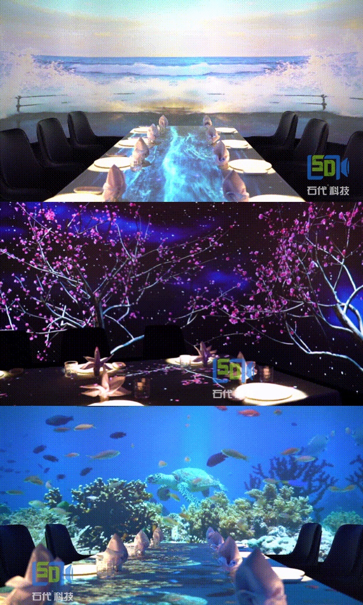 而開頭提到的天璽·桃花源餐廳就是用石代科技5D全息投影技術(shù)完成,身在餐廳能看到巍峨的崇山峻嶺,立體環(huán)繞音質(zhì)系統(tǒng)會(huì)讓你聽到溪水潺潺的流水聲,還有風(fēng)兒吹動(dòng)竹林的沙沙聲……