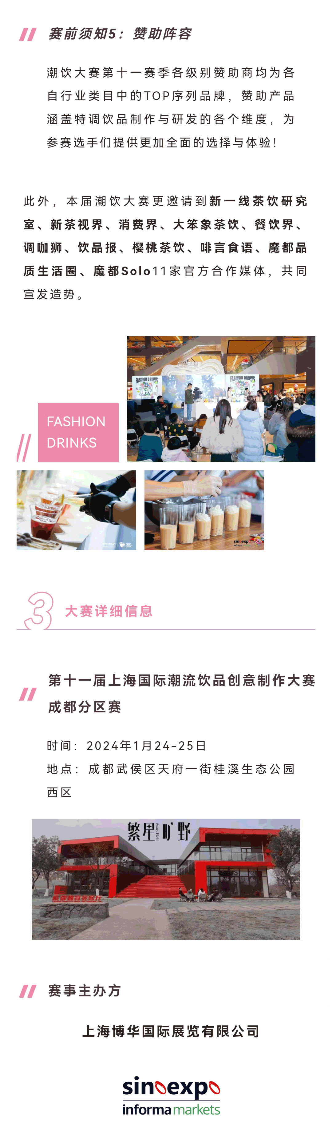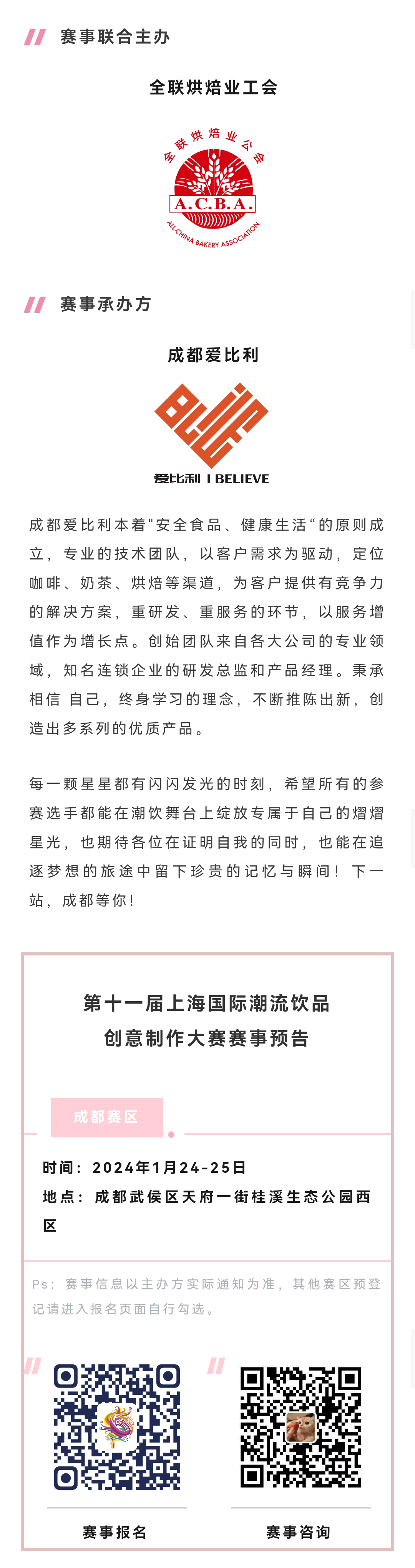 第十一屆上海國(guó)際潮流飲品創(chuàng)意制作大賽成都分區(qū)賽將于2024年1月24-25日落地成都武侯區(qū)天府一街桂溪生態(tài)公園西區(qū),選手招募火熱進(jìn)行中!