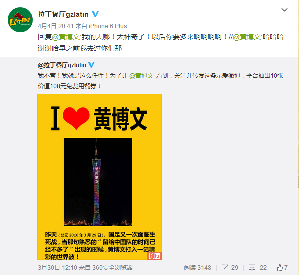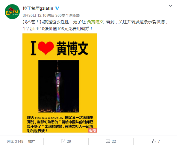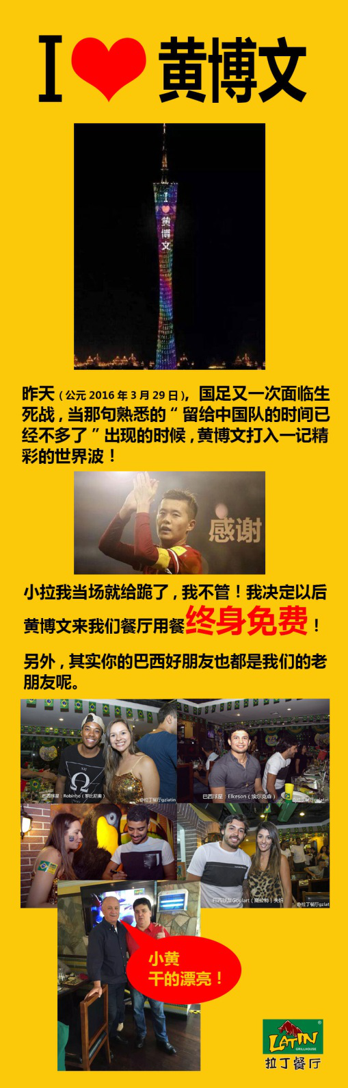 329日,中國男足在大部分球迷都絕望的時候成功打入世界杯亞洲區(qū)十二強(qiáng)復(fù)賽,廣州恒大球員黃博文打入關(guān)鍵一球。廣州拉丁餐廳發(fā)布了這樣一條微博: