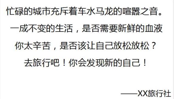 之前看到一個(gè)小旅行社寫的傳播文案,文案大體是這樣: