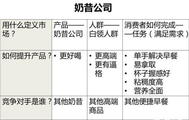 應(yīng)該按照“你的產(chǎn)品如何滿足用戶需求”來定義市場(chǎng),而不是單純用自己的標(biāo)準(zhǔn)來假想一個(gè)市場(chǎng)。(比如奶昔定位成“幫早上開車上班的人,單手解決早餐”這個(gè)市場(chǎng)。)