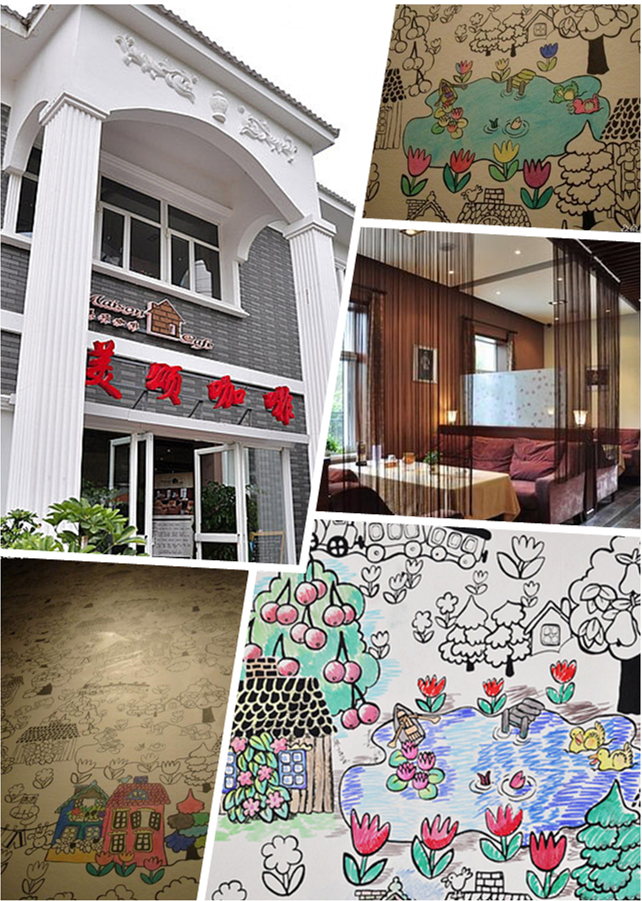 美頌的這面“涂鴉墻”并非完全空白,墻上本身是有許多不帶色彩只有輪廓的兒童畫作。店家會為客人提供彩色筆,讓感興趣的客人能夠帶著小孩子一起在墻上填涂色彩。這種形式是不是有些眼熟呢?其實(shí)這算得上是擴(kuò)大版的“秘密花園”。無論小孩或是大人們,都可以無拘無束地投入到天馬行空的想象和創(chuàng)作當(dāng)中,為大小客人帶來輕松愉悅的氛圍。