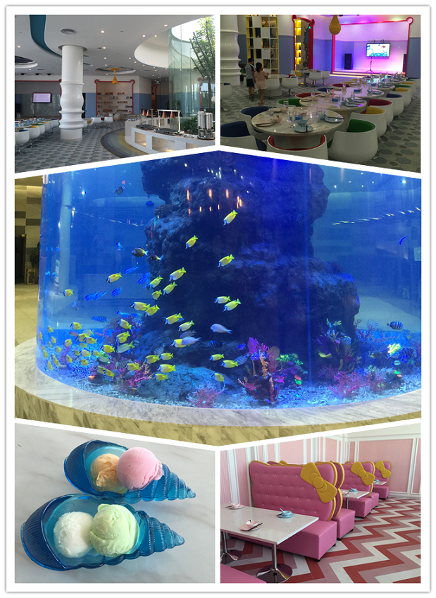 餐廳專門打造了夢幻十足的Hello Kitty區(qū)。粉色不僅是凱蒂貓最愛的顏色,也是最能彰顯小公主們氣質(zhì)的顏色。粉色控的小女孩們可以在這里和Hello Kitty一起度過美妙的時光。而在餐廳中央大廳處,設(shè)置了多個圓柱形的海洋動植物玻璃缸,各種叫不出名字的奇妙魚類在其中暢游嬉戲,仿佛置身于水族館一般。餐廳墻面上,則繪制有多啦a夢、大頭兒子小頭爸爸等眾多深入人心的卡通形象。