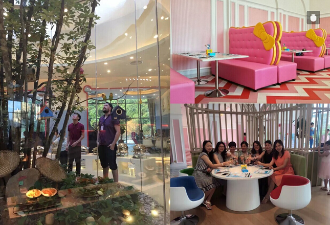 從餐廳大門進(jìn)來,一眼就能看到趣味可愛的鳥籠餐區(qū)。置身于木質(zhì)的巨大鳥籠,被各類綠色植物包圍其中,仿佛穿越到了巨大的國度,讓人大呼過癮。而在餐廳入口的右方,則是夢幻十足的Hello Kitty餐區(qū)。餐區(qū)以粉色為主色調(diào),充滿幻想的設(shè)計(jì),讓孩子們一秒變公主。