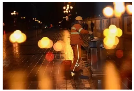微弱的燈光下,他們認(rèn)真清掃著腳下的每一段路