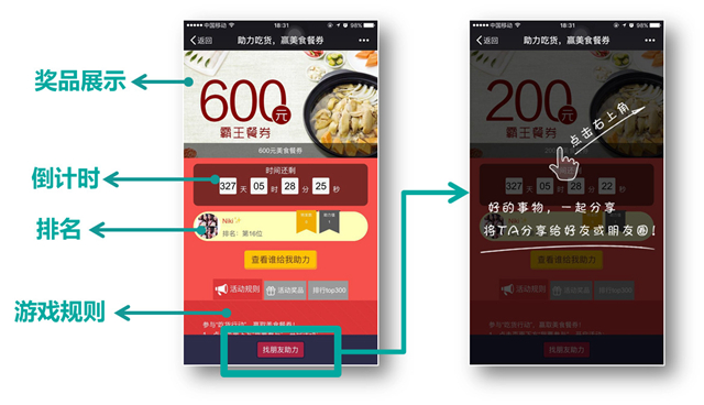 負(fù)責(zé)人介紹說(shuō):“我們?cè)诖舜蔚摹窒碇Α顒?dòng)中設(shè)置一、二、三等獎(jiǎng)各一名,對(duì)應(yīng)的獎(jiǎng)品分別是400元捧場(chǎng)王霸王餐券、200元鐵桿粉現(xiàn)金券和100元強(qiáng)助攻現(xiàn)金券。顧客只要關(guān)注了我們的微信公眾號(hào),點(diǎn)擊菜單欄“新店開(kāi)業(yè)”打開(kāi)活動(dòng)鏈接,點(diǎn)擊“我要參與”就可以報(bào)名參與此活動(dòng)。顧客只需要將活動(dòng)鏈接不斷分享給好友進(jìn)行人氣拉票,最終票數(shù)排名前三甲的顧客即可獲得此三張霸王餐券。”