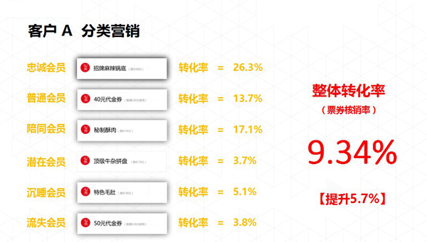 來看一個客戶案例,假如進行無差異化營銷,對所有會員統(tǒng)一發(fā)送50元代金券,那它的轉(zhuǎn)換率只有3.64%。接著對所有會員進行分類,對每一類會員采取不一樣的營銷方式。忠誠會員采用的是招牌菜式進行營銷,對于忠誠會員來說,因為如果店內(nèi)的美食對他沒有吸引力的話那他就不是忠誠會員。普通會員對店內(nèi)的招牌菜還未形成認知,所以采用40元的代金券策略。最終統(tǒng)計得知,整體票券的核銷率達到了9.34%,提升了5.7%。這是因為會員營銷是個性化的,才能夠有這么高的轉(zhuǎn)化率。