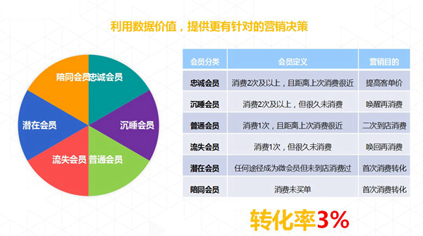 會員活躍分成兩步:消費者分析、精準營銷。我們對消費者進行個性化的分析,從消費能力、消費頻率等方面描繪消費者畫像,對所有粉絲進行了分類:第一類是忠誠會員,第二類是沉睡會員,第三是普通會員,第四是流失會員,第五是潛在會員,第六是陪同會員。我們對會員進行分類定義,每一類會員的營銷目的是不一樣的,每一類會員的營銷方式也不一樣。