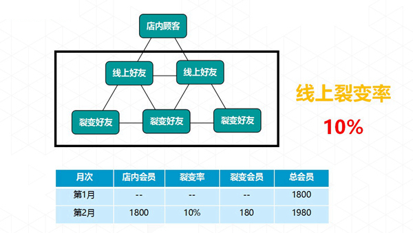 線上的裂變,是互聯(lián)網(wǎng)會員最大的優(yōu)勢,對于店內(nèi)的粉絲大家非常清楚,店內(nèi)的粉絲在線上還有好友,他的好友也能幫你裂變,這等于是幫助所有的餐企在傳播店內(nèi)的信息。如果這個月積累了1800個會員粉絲,線上獲取的是10%的會員裂變,如果懂得社交,在前期進行會員營銷,有可能百分之百翻倍,當想吸粉的時候,獲得的粉絲是1800元,其實是有機會新增10%的,要知道到后面比例數(shù)會降低,10%是拿最低概率值而已。
