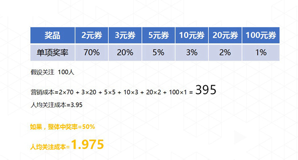 以往的會員,可能大家都會看到掃碼優(yōu)惠,比如掃碼關注贏得100元代金券,這是怎么玩的呢?我們在系統(tǒng)后面設計合理的機制,獲得100元代金券是一個概率,不是每個人都有的,有可能是1%的人才有機會獲得。其他人都是以抽獎的行為獲取這張代金券的。對于產(chǎn)品的設置,100元的代金券可能只有1%的人可以獲取到,對于2元的代金券有70%的機會獲得。如果100人關注,整體成本是395,人均成本就是3.95元。如果整體參與率是50%,那人均成本就更低。