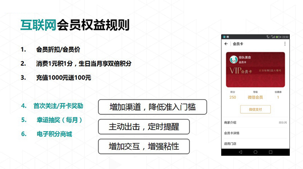 接下是設計一套會員權(quán)益,設計會員權(quán)益的目的是將會員的弱關系變成強關系,提升活躍度,所以每一步設置都應該一步步地引導會員。另外,我們的會員是通過微信會員卡對接的,等于說消費者辦的是微信卡包的會員,同樣有積分、優(yōu)惠,是可以進行合銷兌換的。這樣一來,不僅提升了互聯(lián)網(wǎng)營銷的功能,還降低了辦會員卡的門檻。