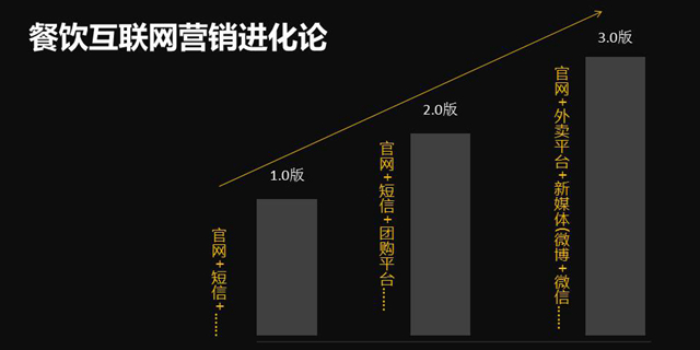 隨著這些改變,我們也越來越能看清餐飲營銷的發(fā)展進化過程:從官網+短信的1.0版本,發(fā)展到官網+短信+團購的2.0版本,再進化到如今的官網+外賣+新媒體的3.0版本。