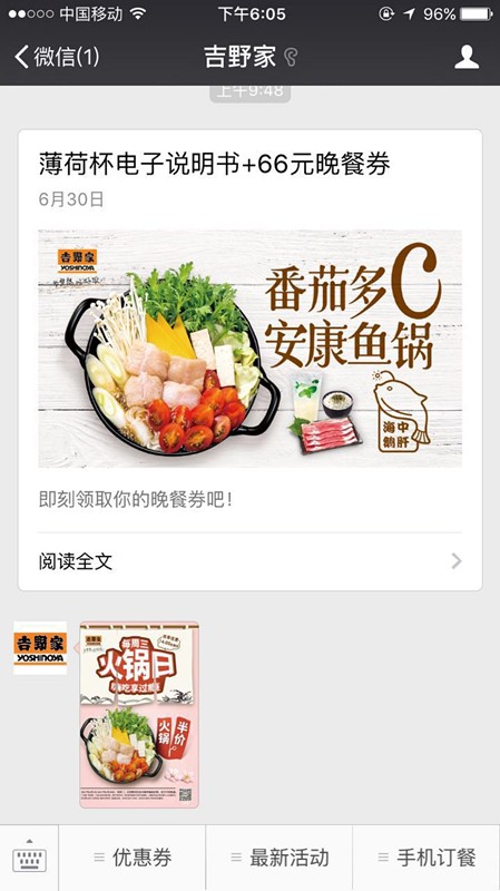 現(xiàn)在已有很多經(jīng)營者懂得用微信公眾號去進行營銷,培養(yǎng)粉絲,定期推送餐品信息,活動信息等。用戶一關(guān)注公眾號即可領(lǐng)取優(yōu)惠券,查看最新活動,使用自助點餐功能。定期結(jié)合熱點策劃推送活動信息、餐飲信息給粉絲,粉絲可以在微信實時評論,與微信運營者保持良好互動。
