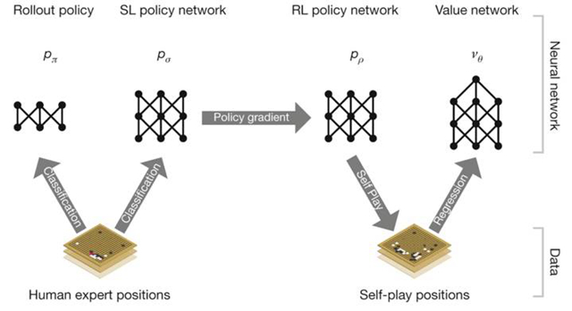 ▲AlphaGo 使用兩種人工神經(jīng)網(wǎng)絡(luò)進(jìn)行學(xué)習(xí):預(yù)測網(wǎng)絡(luò)(policy network)和評(píng)估網(wǎng)絡(luò)(value network)。