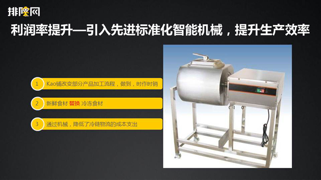 同時(shí)我們做了改革,將部分標(biāo)準(zhǔn)化設(shè)備放到我們的店內(nèi)完成,降低流程。大家做供應(yīng)鏈的時(shí)候,發(fā)現(xiàn)有一個(gè)成本特別高的,就是冷鏈物流成本。KAO鋪為了規(guī)避冷鏈物流成本特別高,就將很多生產(chǎn)環(huán)節(jié)放到門店自己來進(jìn)行預(yù)制,這樣就能節(jié)省我們的物流支出。