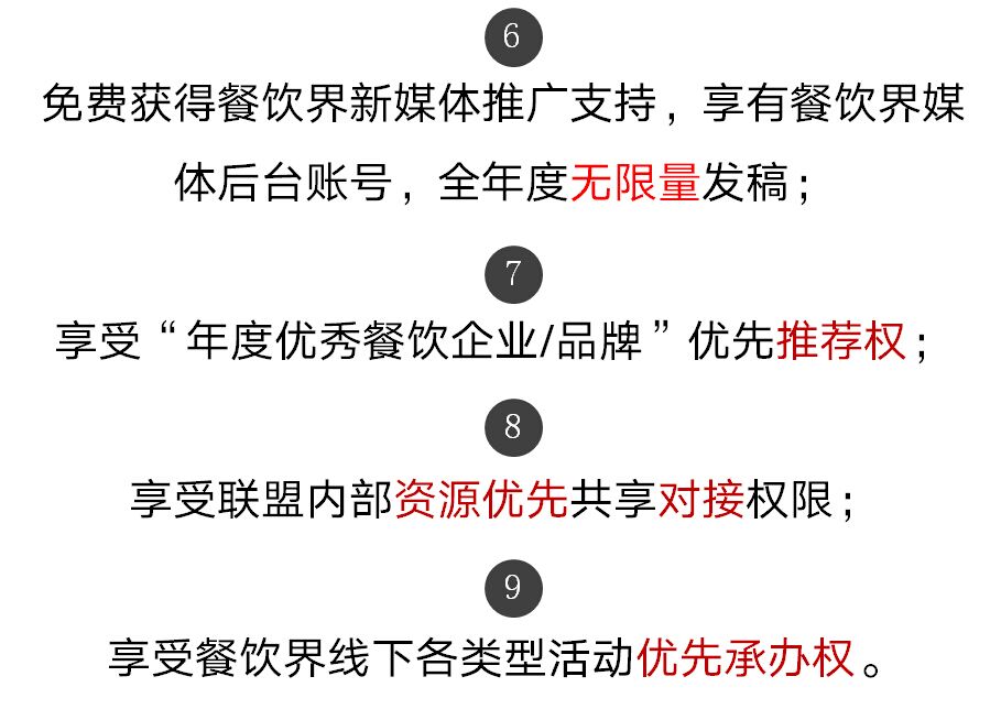 8、享受“年度優(yōu)秀餐飲企業(yè)/品牌”優(yōu)先推薦權(quán);