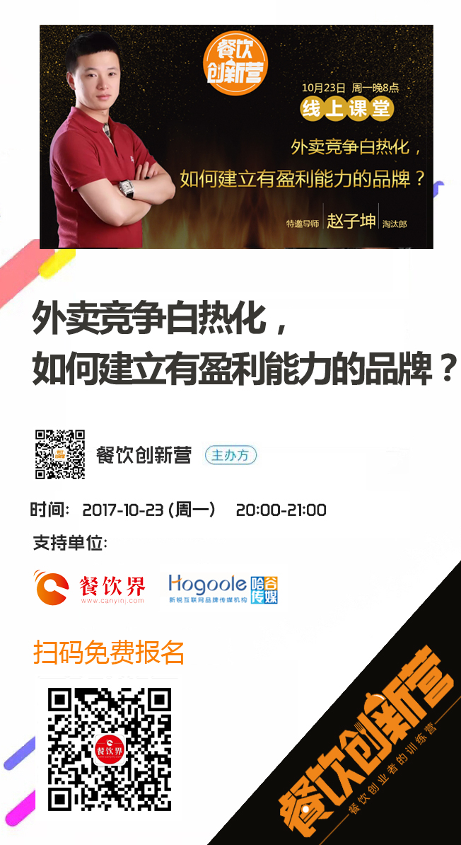 一個人的時候,想吃火鍋怎么辦? 一家火鍋店在全國各地該如何運營? 專注外賣行業(yè)創(chuàng)業(yè)是否可行? 沒有市場預算又如何成功做好外賣? 10月23日晚八點, 餐飲界新媒體聯(lián)合餐飲創(chuàng)新營特邀淘汰郎火鍋創(chuàng)始人兼CEO趙子坤 跟大家聊聊外賣競爭白熱化,如何建立有盈利能力的品牌?