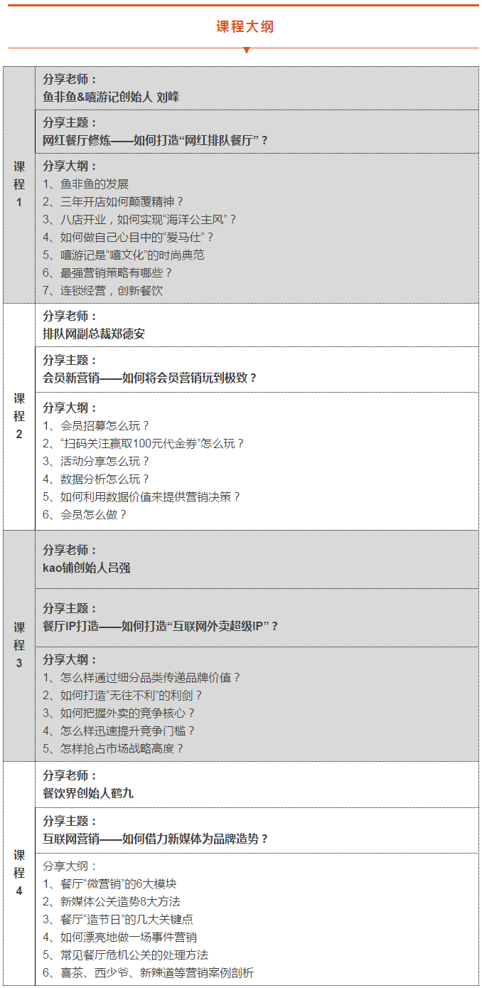 本期創(chuàng)新?tīng)I(yíng)將邀請(qǐng)四位在互聯(lián)網(wǎng)營(yíng)銷(xiāo)上頗有心得的業(yè)內(nèi)人士參與,從網(wǎng)紅餐廳&超級(jí)IP塑造、會(huì)員營(yíng)銷(xiāo)、新媒體營(yíng)銷(xiāo)、危機(jī)公關(guān)等角度,全面覆蓋互聯(lián)網(wǎng)營(yíng)銷(xiāo)關(guān)鍵點(diǎn)。