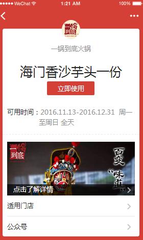 在廣告創(chuàng)意上,一鍋到底以文案“煮一鍋紅艷,品百味人生”配合圖片四川經(jīng)典的變臉形象烹制火鍋,重慶火鍋紅油翻滾的場景躍然眼前,讓吃貨們浮想聯(lián)翩。用戶點(diǎn)擊“領(lǐng)取優(yōu)惠”,可直接跳轉(zhuǎn)到卡券領(lǐng)取頁面,免費(fèi)獲得一份海門香沙芋頭的福利,憑核銷碼到店消費(fèi)??ㄈ撁媲度胍?guī)則介紹和適用門店,促進(jìn)用戶到店。