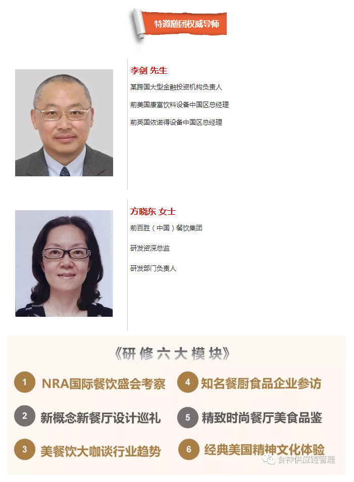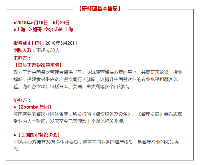 【良辰美饌餐飲商學(xué)院】重磅推出“中國(guó)餐飲精益管理美國(guó)高端研修團(tuán)”,現(xiàn)向餐飲業(yè)精英發(fā)出召集令------讓我們一同啟程探尋美國(guó)餐飲文化之風(fēng)采:展會(huì)調(diào)研、名企參訪、大咖交流、餐廳巡禮、跨界體驗(yàn)、美食品鑒...... 匯聚獨(dú)家高端資源,精彩不容錯(cuò)過!