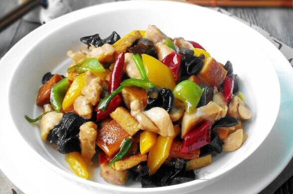 6. 再熱油鍋,把雞肉放鍋中炒至變色盛出;