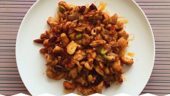 5. 倒入蔥姜蒜炒香,倒入雞丁反復(fù)翻炒直至雞丁縮水后熟至金黃色;