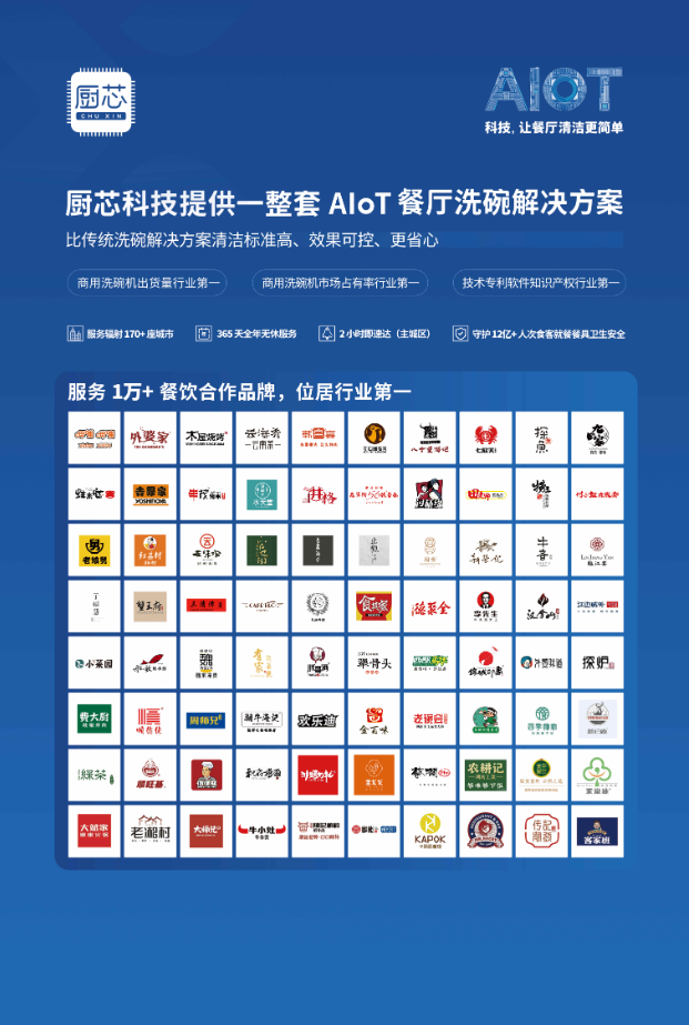 據(jù)悉,廚芯科技AIoT餐廳洗碗解決方案從“聯(lián)網(wǎng)智能洗碗機+高倍凈力小桶上墻清洗劑+即速響應(yīng)服務(wù)+數(shù)據(jù)化管理工具”全面解決餐廳洗碗難題,高壓去漬、立體沖洗、智溫消毒、全維催干的整個洗碗過程控制在60秒以內(nèi),批量清洗,高度節(jié)省人工。配以自主研發(fā)的餐具清洗劑,上墻技術(shù)更加節(jié)省空間。