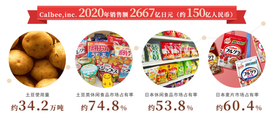 卡樂比Calbee品牌于1949年成立于日本廣島,覆蓋休閑食品和麥片系列。已經(jīng)73歲的卡樂比在銷量和口碑上遙遙領(lǐng)先,,堪稱日本國民零食品牌。一年的土豆使用量就到達(dá)驚人的34.2萬噸,土豆類休閑食品市場占有率約74.8%,在薯類零食這一賽道,卡樂比已經(jīng)遙遙領(lǐng)先。