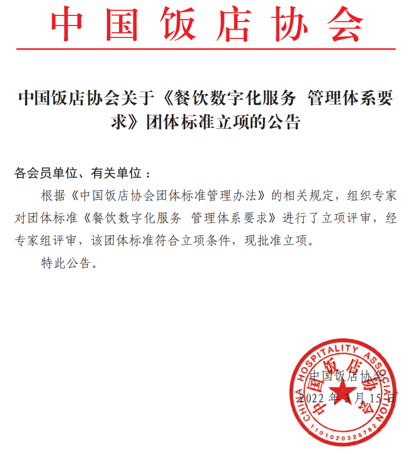 近日,由中國計量大學、中國標準化研究院、嘩啦啦、中國飯店協會牽頭起草的《餐飲數字化服務 管理體系要求》正式通過立項,成為國內餐飲數字化服務領域首個管理體系標準。