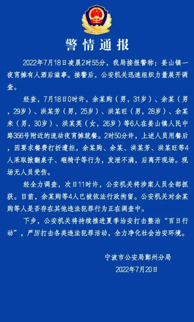 7月20日,寧波市公安局鄞州分局通報(bào)“多名男子打砸燒烤攤”事件,表示公安機(jī)關(guān)已將涉案人員全部抓獲。目前,余某購等涉案人員4人已被依法行政拘留。