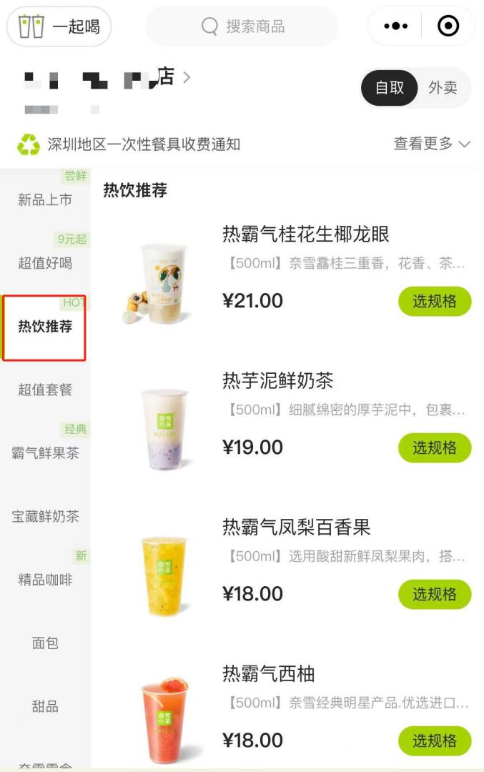 圖:奈雪點(diǎn)單小程序“熱飲推薦”