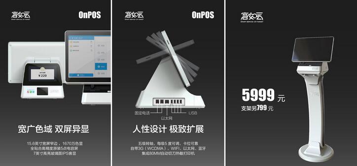 以 B 端和 C 端的接觸點為切入點,從最初的預(yù)定環(huán)節(jié),而后升級為全套的 SaaS 服務(wù)。這次它又搬出新東西了,而且是看得見摸得著的實物了,軟硬件一體智能終端 OnPOS。這次的新產(chǎn)品,更像是客如云成立 3年 來的總體匯報演出。