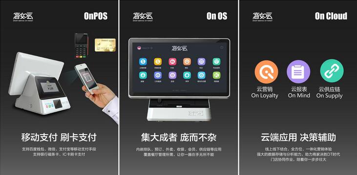 據(jù)彭雷介紹,On 是客如云的基本辨識,硬件 OnPOS,軟件 On OS,云端 On Cloud 以及對外開放平臺 On Store。
