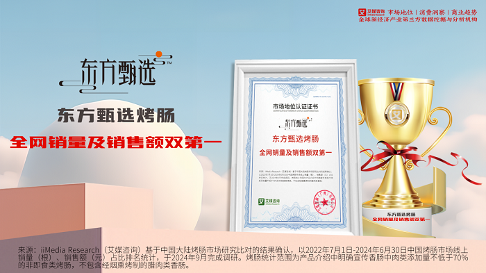 2024年9月,東方甄選烤腸獲全球新經(jīng)濟(jì)產(chǎn)業(yè)第三方數(shù)據(jù)挖掘和分析機(jī)構(gòu)iiMedia Research(艾媒咨詢)授予的“全網(wǎng)銷量及銷售額雙第一(統(tǒng)計(jì)范圍:中國(guó)大陸市場(chǎng)2022年7月-2024年6月)”市場(chǎng)地位確認(rèn)。