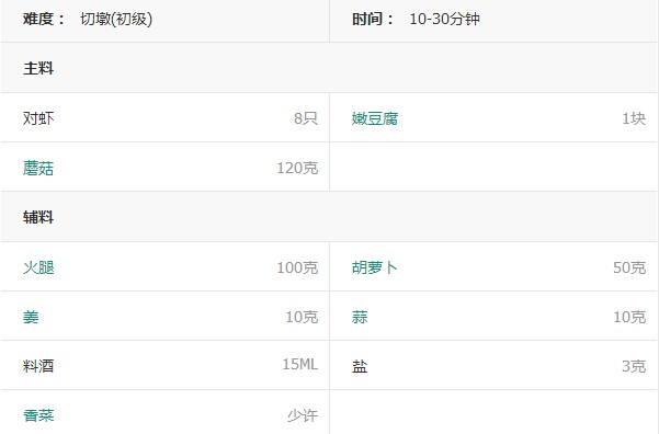 1. 準(zhǔn)備食材:對蝦剪去須,背部開刀去除黑線,火腿切薄片,嫩豆腐切塊,蘑菇切片,胡蘿卜削皮切片。