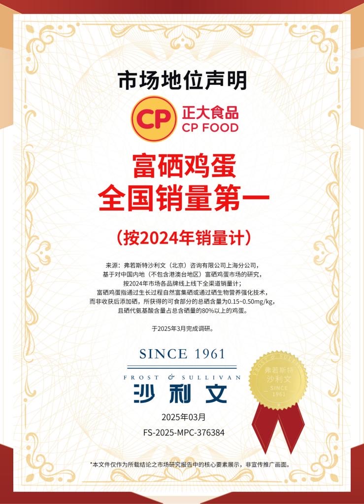 在健康消費(fèi)大潮下,富硒食品正成為越來(lái)越多消費(fèi)者的優(yōu)選。近日,正大富硒雞蛋憑借卓越的品質(zhì)、嚴(yán)格的安全標(biāo)準(zhǔn)和消費(fèi)者的高度認(rèn)可,獲沙利文認(rèn)證“2024年度富硒雞蛋全國(guó)銷量第一”。這一認(rèn)證不僅是市場(chǎng)對(duì)正大富硒雞蛋的高度認(rèn)可,更是健康飲食趨勢(shì)下消費(fèi)者信賴的見(jiàn)證。