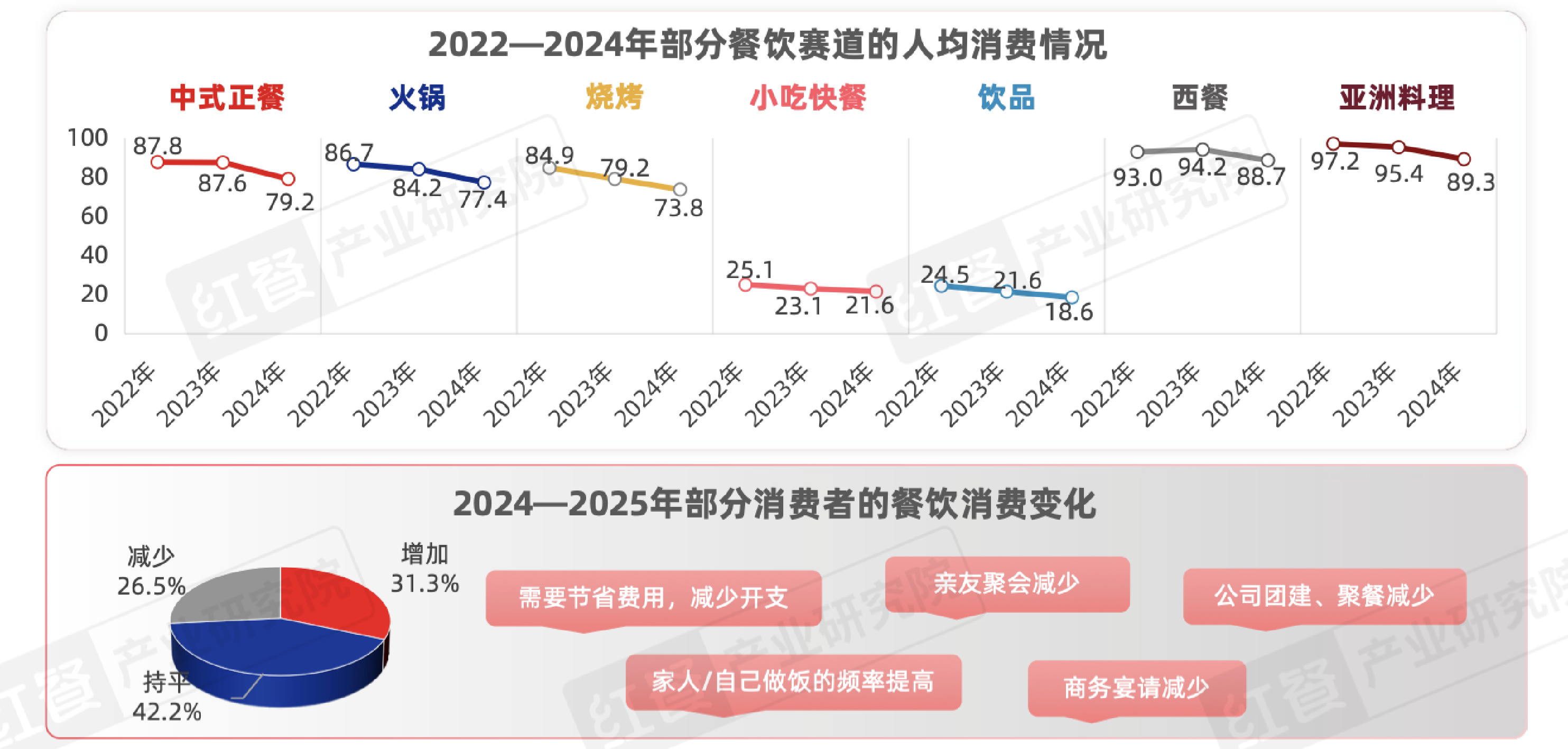 一方面,全國餐飲連鎖化率持續(xù)攀升,根據(jù)紅餐大數(shù)據(jù)、美團和紅餐產(chǎn)業(yè)研究院的統(tǒng)計,2025年全國餐飲連鎖化率預(yù)計將提升至24%,其中現(xiàn)制飲品連鎖化率更是高達52%;但另一方面,2024年人均餐飲消費已降至39.8元,消費支出增加的消費者占比從50%驟降至31.3%。這種“規(guī)模擴張”與“利潤收縮”的剪刀差,正在將行業(yè)推向深水區(qū)。