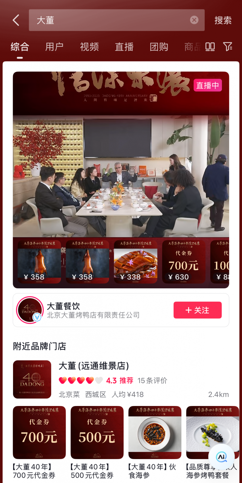 今年1月9日,大董入駐抖音生活服務(wù)平臺(tái)。數(shù)據(jù)顯示,截至4月28日,全國(guó)各城市門店陸續(xù)開啟直播,直播間曝光超900萬(wàn)次。近雙月,大董抖音搜索環(huán)比提升40%,支付環(huán)比增長(zhǎng)85%。其中,新客下單占比超90%,環(huán)比增長(zhǎng)165%。周年慶活動(dòng)不僅讓大董吸引了大量關(guān)注,還成功將流量轉(zhuǎn)化為實(shí)際消費(fèi)。