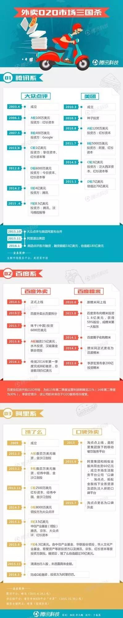 百度在2014年就開始低調(diào)布局O2O,這從其在2014年初全資收購糯米可窺見一斑。同時,百度從2014年開始啟動服務(wù)轉(zhuǎn)型戰(zhàn)略,連接人與服務(wù),并投資了Uber,并在2014年5月上線了百度外賣,并于2015年7月完成分拆。在投資策略上,百度決定未來三年投資200億現(xiàn)金支持百度糯米,成為互聯(lián)網(wǎng)巨頭在O2O業(yè)務(wù)上最大的單筆投資。