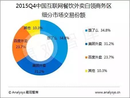 回顧去年競爭格局,餓了么憑借33.7%的整體份額繼續(xù)領(lǐng)跑,美團(tuán)外賣和百度外賣以33.1%和19%隨其后。白領(lǐng)市場方面,餓了么同樣以34.8%位居第一,美團(tuán)外賣和百度外賣分別以31.2%和23.7%分列第二三名,三者合計份額接近九成,壟斷程度甚于整體市場。