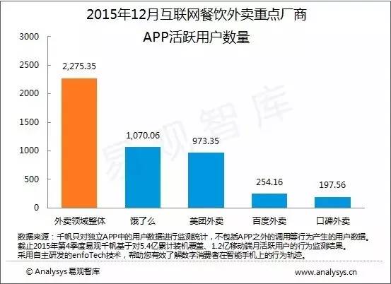 用戶活躍度方面,2015年12月的外賣市場整體APP活躍用戶數(shù)量為2275.35萬戶,其中,餓了么活躍用戶達(dá)1070.06萬戶,占比接近一半,美團(tuán)外賣活躍用戶達(dá)973.350萬戶,二者組成第一集團(tuán)。由百度外賣和口碑外賣組成的第二集團(tuán)則分別只有200多萬的的活躍用戶,差距較大。