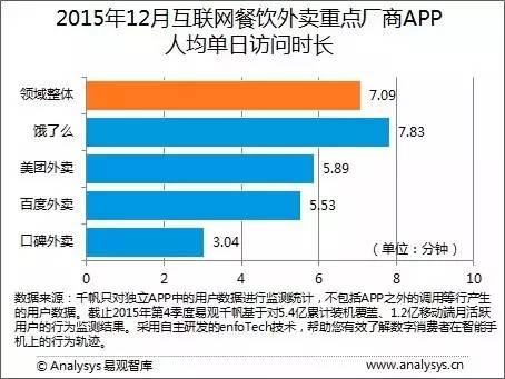 數(shù)據(jù)顯示,2015年12月餓了么的人均單日訪問時長為7.83分鐘,高于外賣領(lǐng)域整體APP人均單日訪問時長的7.09分鐘。在人均單日啟動次數(shù)方面,餓了么以3.6次同樣位居第一。