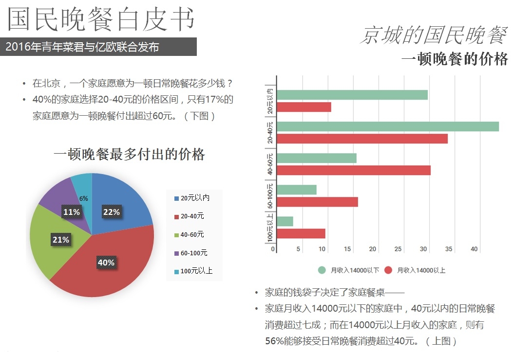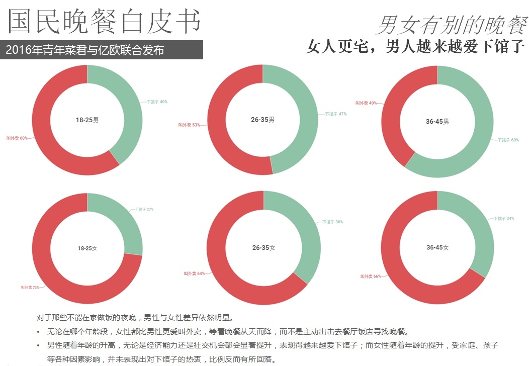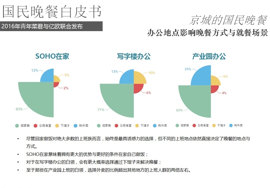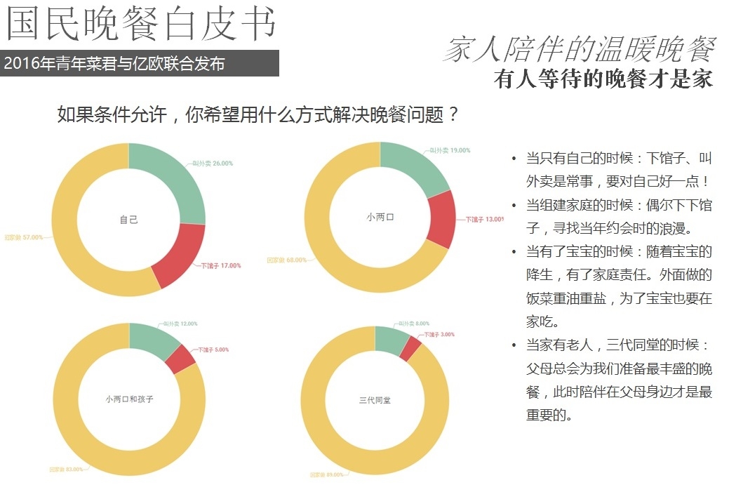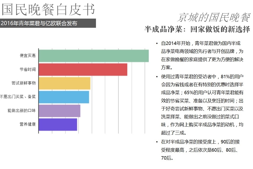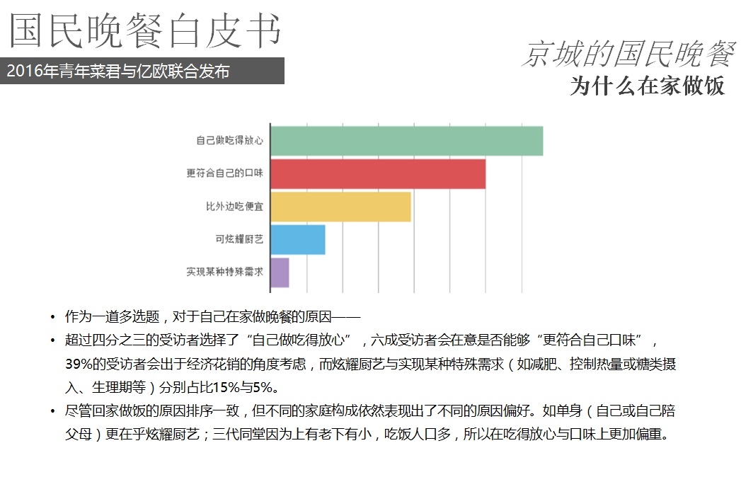 2016年5月18日,億歐聯(lián)合青年菜君發(fā)布北京國民晚餐數(shù)據(jù)白皮書,報告從晚餐種類、口味、價格、場所、訴求等角度進(jìn)行用戶分析,以5000份調(diào)查問卷數(shù)據(jù)為基礎(chǔ),反映國民的晚餐飲食習(xí)慣以及回家做飯和外賣的不同選擇。
