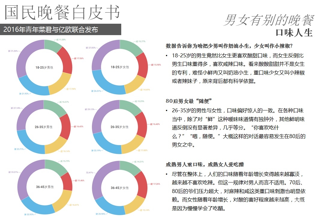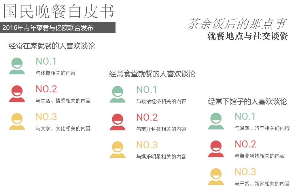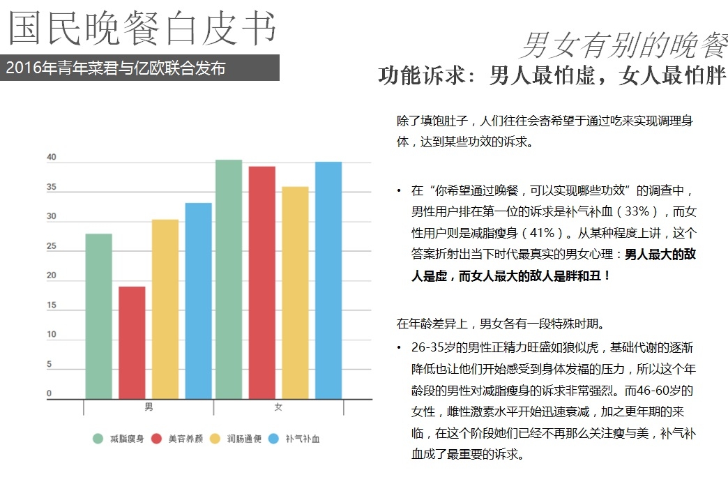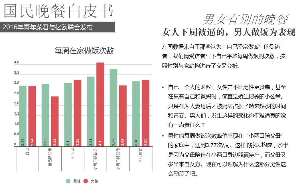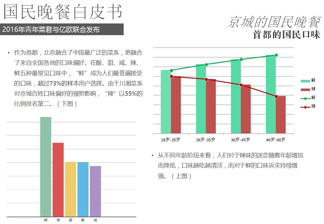2016年5月18日,億歐聯(lián)合青年菜君發(fā)布北京國民晚餐數(shù)據(jù)白皮書,報告從晚餐種類、口味、價格、場所、訴求等角度進(jìn)行用戶分析,以5000份調(diào)查問卷數(shù)據(jù)為基礎(chǔ),反映國民的晚餐飲食習(xí)慣以及回家做飯和外賣的不同選擇。