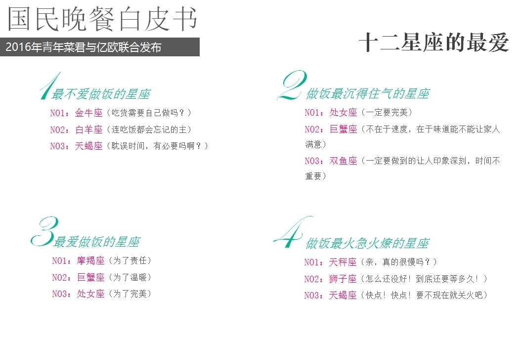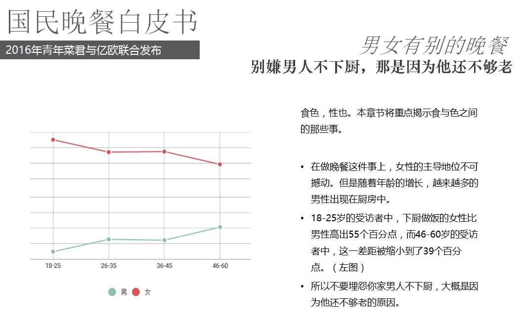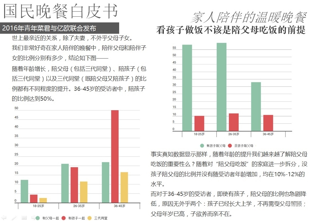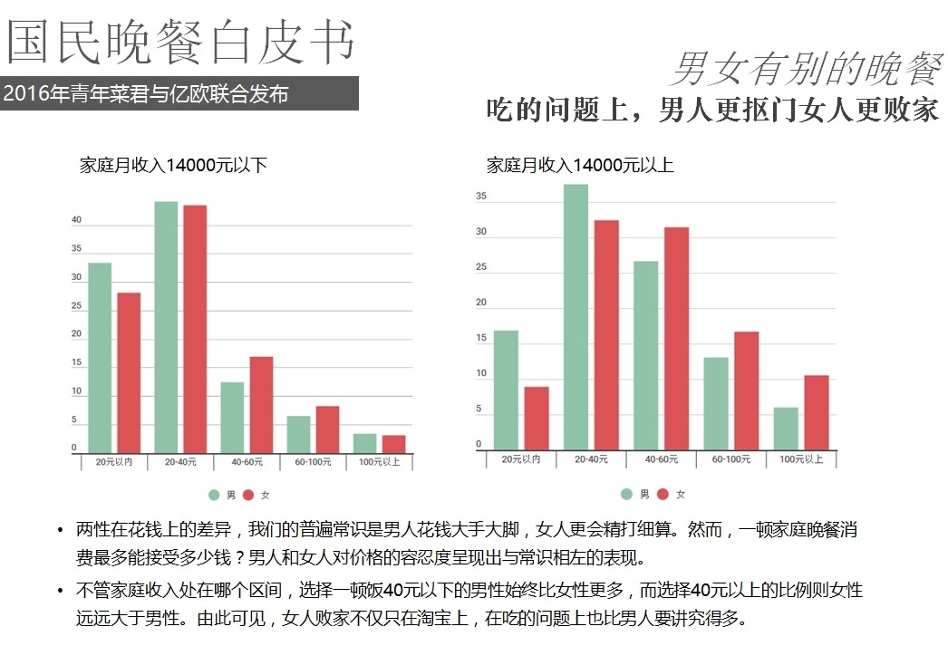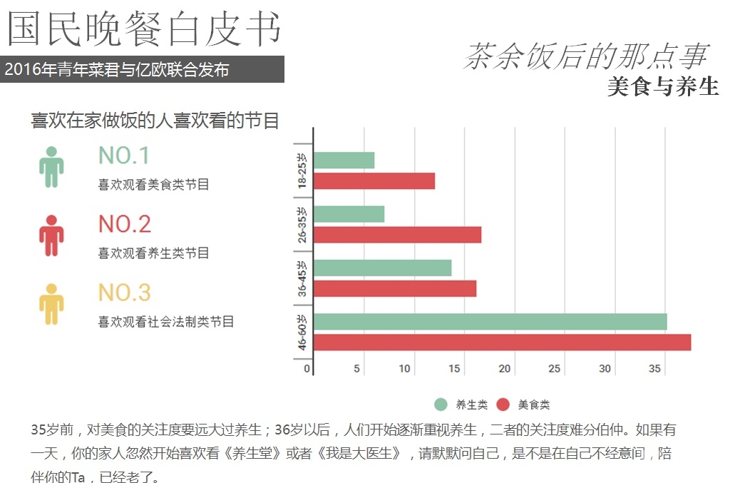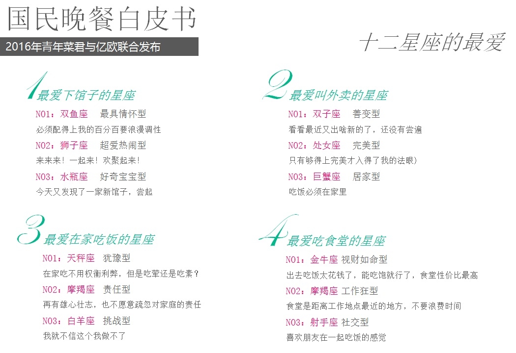 2016年5月18日,億歐聯(lián)合青年菜君發(fā)布北京國民晚餐數(shù)據(jù)白皮書,報告從晚餐種類、口味、價格、場所、訴求等角度進(jìn)行用戶分析,以5000份調(diào)查問卷數(shù)據(jù)為基礎(chǔ),反映國民的晚餐飲食習(xí)慣以及回家做飯和外賣的不同選擇。