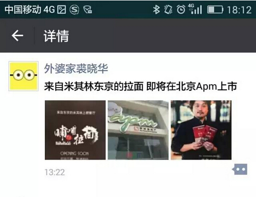 520這天中午,外婆家總裁裘曉華在微信朋友圈說(shuō):“來(lái)自米其林東京的拉面,即將在北京APM上市?!?/span>